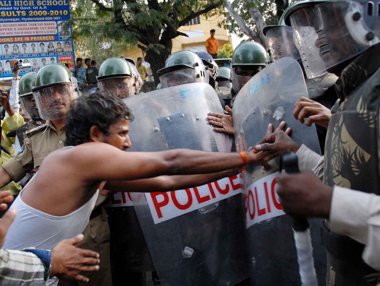 Protest by students at OU demanding cancellation of recruitment test for police Sub-Inspectors. OU students burnt the effigy of MP Kavuri Sambasivarao for his alleged remarks against tribals. Police resort to caning and later arrest the protesters when they tried took out a rally on Tuesday. INN Photos