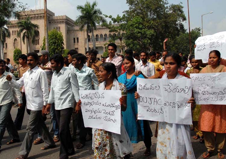 Protest by students at OU demanding cancellation of recruitment test for police Sub-Inspectors. OU students burnt the effigy of MP Kavuri Sambasivarao for his alleged remarks against tribals. Police resort to caning and later arrest the protesters when they tried took out a rally on Tuesday. INN Photos