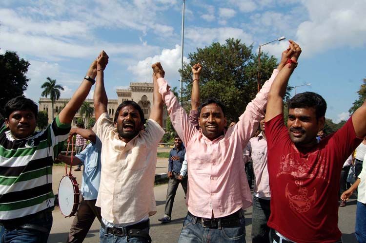 Osmania University students seat an effigy depicting Chief Minister K Rosaiah atop a buffalo and ride it on the Arts College lawns before setting it alight in protest against the government's adamant attitude over the conducting of the recruitment test for Sub-Inspectors, in Hyderabad on Friday. The government later announced the postponement of the tests. The news brought joy and smiles to the otherwise tense campus, changing the mood of students from agony to ecstasy within no time. INN Photos