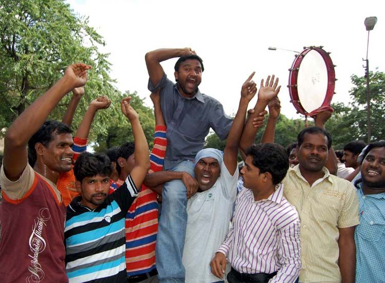 Osmania University students seat an effigy depicting Chief Minister K Rosaiah atop a buffalo and ride it on the Arts College lawns before setting it alight in protest against the government's adamant attitude over the conducting of the recruitment test for Sub-Inspectors, in Hyderabad on Friday. The government later announced the postponement of the tests. The news brought joy and smiles to the otherwise tense campus, changing the mood of students from agony to ecstasy within no time. INN Photos