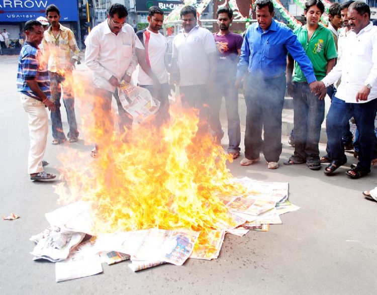 Congress activists protest by burning copies of the newspaper in front of the Sakshi office on the busy Banjara Hills Road No 1 stretch in Hyderabad on Sunday. INN Photos