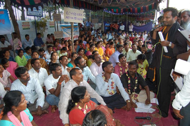 PRP MLA Anil Kumar addresses the protestors who are on a hunger strike against the non-implementation of Indira Kranti scheme at Indira Park in Hyderabad on Monday. INN Photos