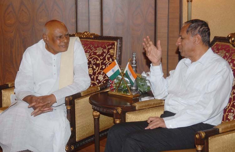 Chief Minister K Rosaiah offers a bouquet of flowers to Governor ESL Narasimhan during his visit to the Raj Bhavan to tender his resignation in Hyderabad on Wednesday. Mr Rosaiah's resignation was accepted by the Governor, who asked the Chief Minister to continue in his post till alternate arrangements are made. INN Photos