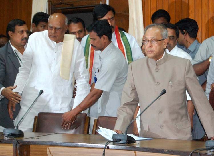 Senior Congress leader, AICC observer Pranab Mukherji announcing Congress President Sonia Gandhi's decision of nominating Speaker N.Kiran Kumar Reddy as new CM of AP soon after the conclusion of emergency CLP meet which endorsed Gandhi to decide on Rosiah's successor. Also seen in picture, are A.K Anthony, Ghulamnabi Azad, Veerappa Moily, K.Roshaiah, D.Srinivas, Geeta Reddy at Assembly commetee hall in Hyderabad on Wednesday night.