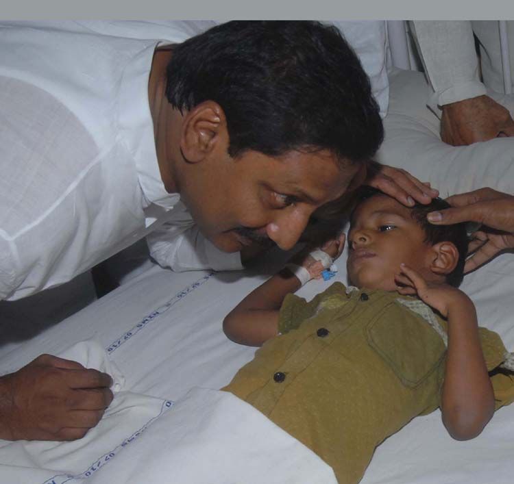 Chief Minister N Kiran Kumar Reddy inquires about the health of a young patient during his maiden visit to the Nizam's Institute of Medical Sciences soon after taking oath, in Hyderabad on Thursday. INN Photos