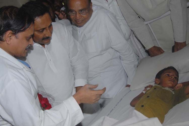 Chief Minister N Kiran Kumar Reddy inquires about the health of a young patient during his maiden visit to the Nizam's Institute of Medical Sciences soon after taking oath, in Hyderabad on Thursday. INN Photos