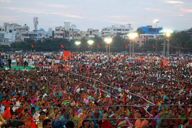 Members of the Hindu Community converge at the NTR Stadium for a 'Hanuman Chalisa' to invoke Divine blessings for the construction of a Ram Mandir in Ayodhya. VHP president Ashok Singhal is seen addressing the mammoth crowd in Hyderabad on Saturday. INN Photos