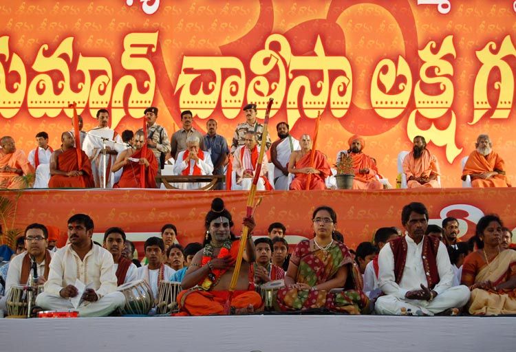 Members of the Hindu Community converge at the NTR Stadium for a 'Hanuman Chalisa' to invoke Divine blessings for the construction of a Ram Mandir in Ayodhya. VHP president Ashok Singhal is seen addressing the mammoth crowd in Hyderabad on Saturday. INN Photos