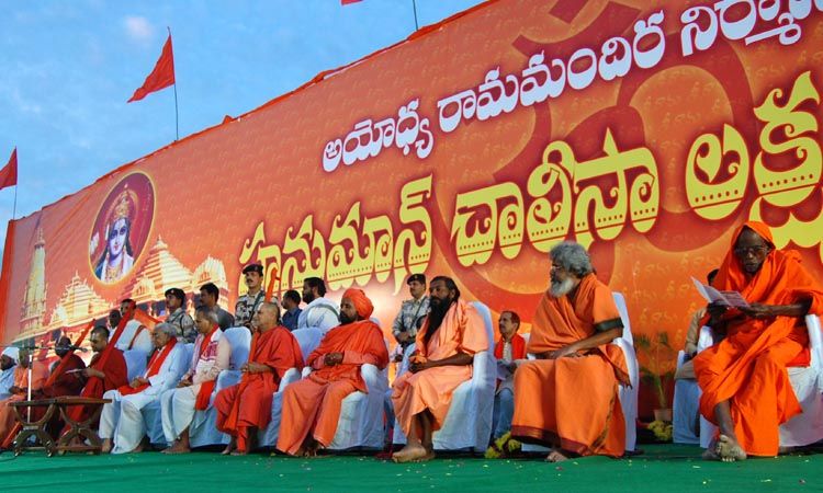 Members of the Hindu Community converge at the NTR Stadium for a 'Hanuman Chalisa' to invoke Divine blessings for the construction of a Ram Mandir in Ayodhya. VHP president Ashok Singhal is seen addressing the mammoth crowd in Hyderabad on Saturday. INN Photos