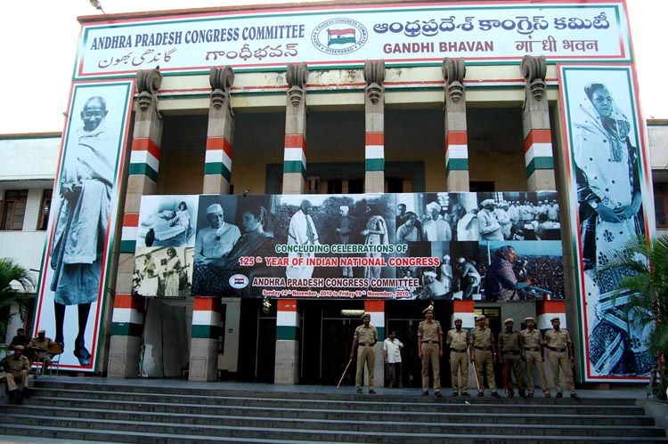 Apprehending any untoward incidents, the police have enhanced security at state Congress headquarters, Gandhi Bhavan in Hyderabad on Monday. INN Photos
