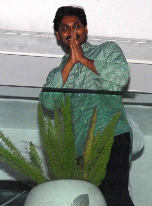 Kadapa MP YS Jaganmohan Reddy greets his supporters after resigning from the Congress party outside his residence at Banjara Hills in Hyderabad on Monday. INN Photos