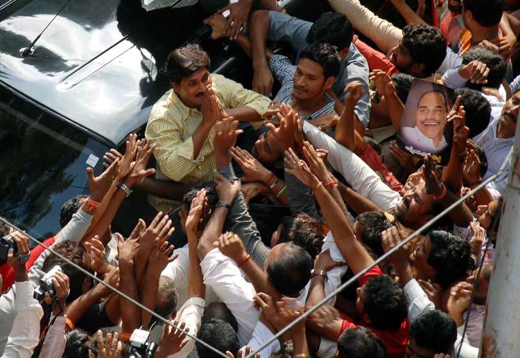Supporters of Jagan gathered at his residence in Sagar Society cheer him for his decision to leave Congress party. Jagan greets them before leaving for Kadapa on Monday evening.
