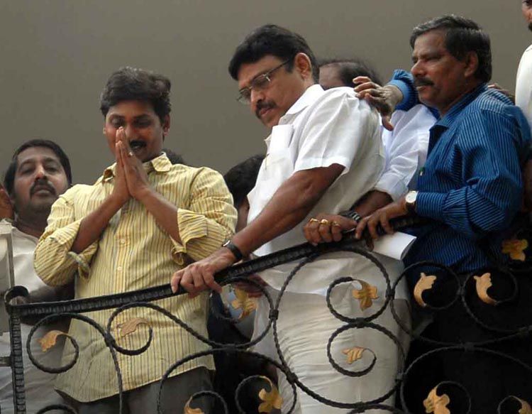 Supporters of Jagan gathered at his residence in Sagar Society cheer him for his decision to leave Congress party. Jagan greets them before leaving for Kadapa on Monday evening.