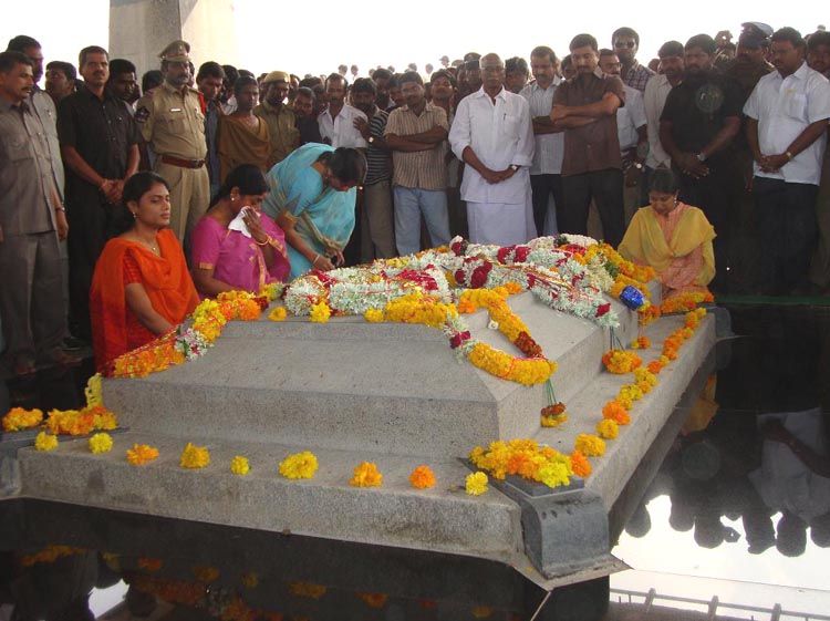 YSR's widow Vijayamma, daughter Sharmila, daughter-in-law Bharati paying floral tributes to late YSR at his samadhi in Idupulapaya estate on Tuesday.