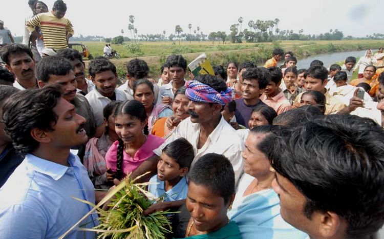 YS Jaganmohan Reddy, the ex-Kadapa MP, consoling farmers during his Rytu Odarpu Yatra in Guntur District of Andhra Pradesh.