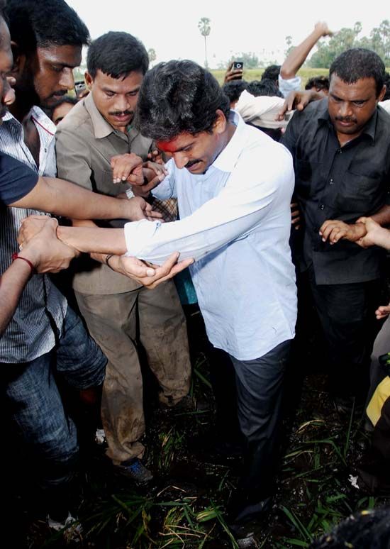 YS Jaganmohan Reddy, the ex-Kadapa MP, consoling farmers during his Rytu Odarpu Yatra in Guntur District of Andhra Pradesh.