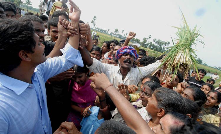 YS Jaganmohan Reddy, the ex-Kadapa MP, consoling farmers during his Rytu Odarpu Yatra in Guntur District of Andhra Pradesh.