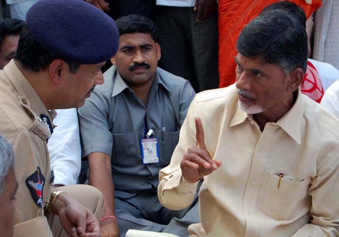 TDP president N Chandrababu Naidu, along with Left parties leaders staged a rasta roko in front of the Assembly in Hyderabad on Monday. Later police took Naidu and other TDP, Left MLA's into their custody. They were shifted to Goshamahal PS where the leaders continued their protest. INN Photos