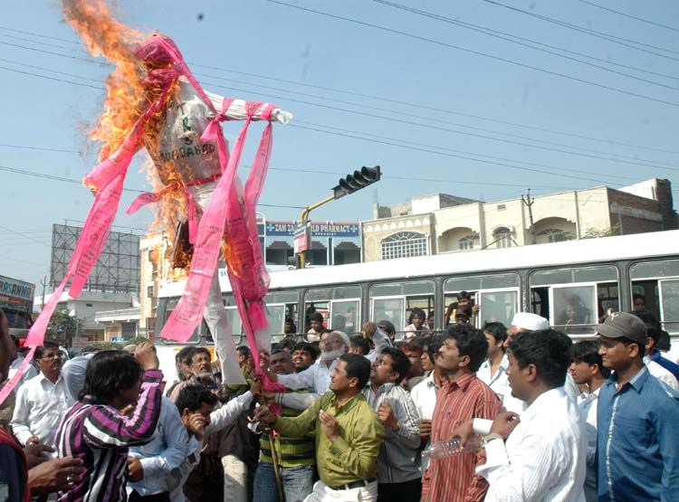 The verbal duels between the MIM and the TRS Legislators ignited passions to an extent that the MIM activists set fire to an effigy of Telangana Rashtra Samithi president K Chandrasekhar Rao at Chandriyangutta in Hyderabad on Tuesday. INN Photos