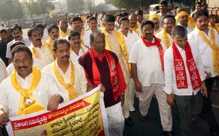Former chief minister and Telugu Desam Party president N Chandrababu Naidu leads his party activists on a padayatra from Gosha Mahal Police Station to Assembly in Hyderabad on Tuesday. Mr Naidu was lodged in the police station along with his party MLAs after being arrested for protesting against the governmental apathy towards rain-hit farmers. INN Photos