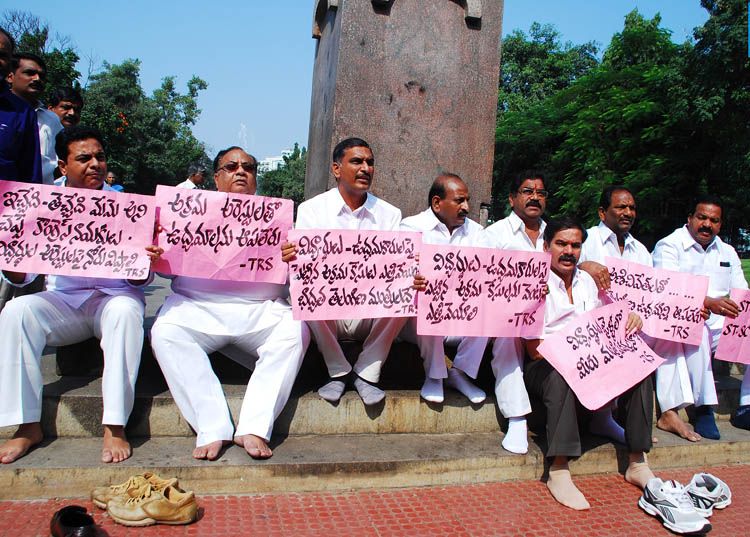 TRS MLAs stage a sit in protest at Gun Park opposite to Assembly after they were suspended from the house on Tuesday.