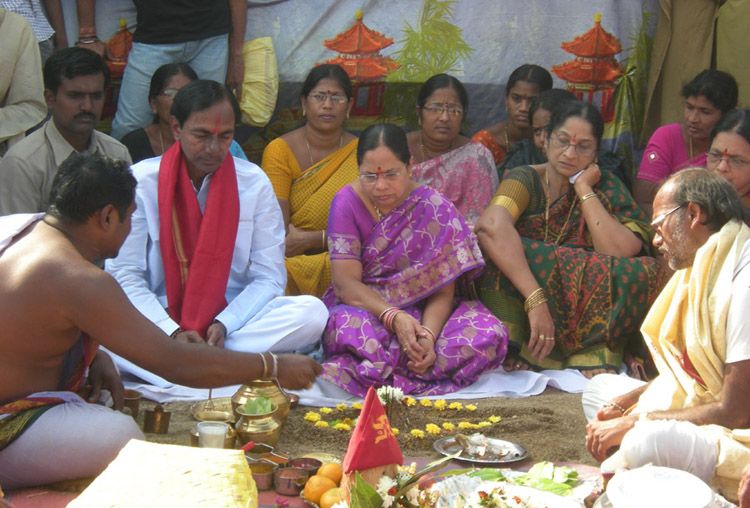TRS Chief K.Chandrasekhara Rao along with his family members take part in pushkara snanam and other rituals on the banks of Pranahita river at Arjuna Gutta in Adilabad district on Tuesday.