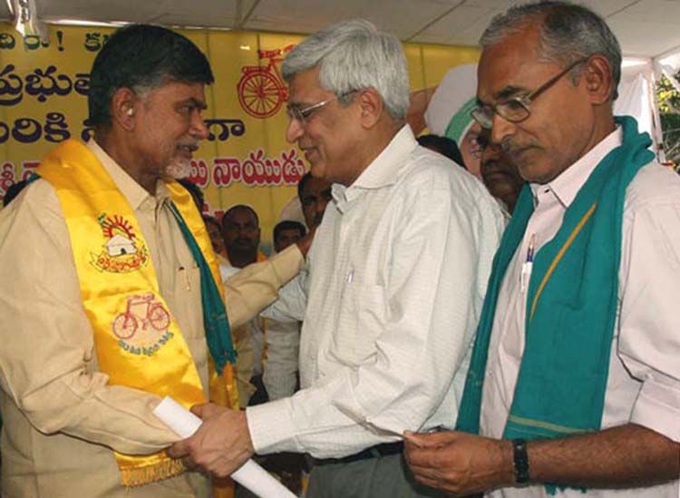 Telugu Desam Party president N Chandrababu Naidu welcomes CPM secretary general Prakash Karat, who called on him along with party state secretary BV Raghavulu at New MLA Quarters, Adarsh Nagar in Hyderabad on Saturday. INN Photos