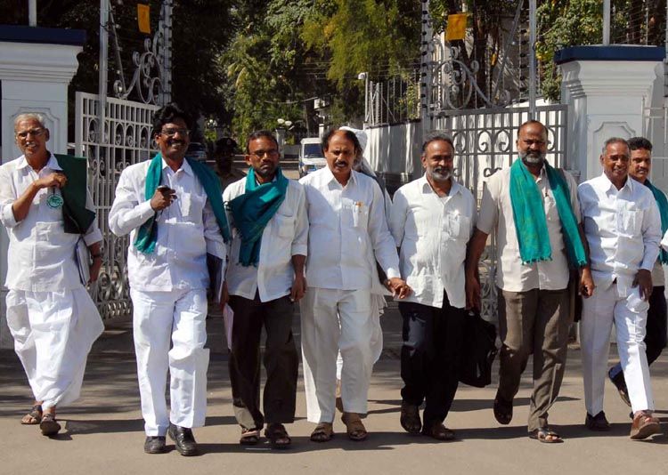 Farmers leaders coming out of Raj Bhavan after submitting a memorandum to Governor ESL Narasimhan at the Raj Bhavan in Hyderabad on Monday. INN Photos