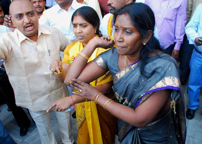 TDP woman Corporators display the scratches they suffered at the hands of woman Home Guards after being evicted out of the Council Hall of the GHMC in Hyderabad on Tuesday. INN Photos
