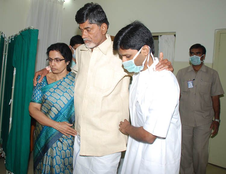 TDP President N.Chandrababu Naidu who is continuing indefinite hunger strike even as his health deteriorated on Tuesday being helped by his wife Nara Bhuvaneswari to take a few steps in his room at NIMS.