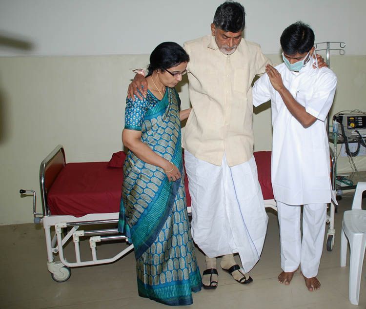 TDP President N.Chandrababu Naidu who is continuing indefinite hunger strike even as his health deteriorated on Tuesday being helped by his wife Nara Bhuvaneswari to take a few steps in his room at NIMS.