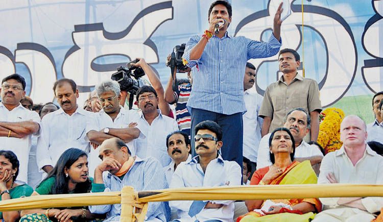 Lakshya Deeksha: Former MP Y.S. Jaganmohan Reddy on 48 hour fast on a specially erected dias on the Krishna river bed in Vijayawada. More than 22 Congress MLA's said to have expressed their solidarity with Jagan.