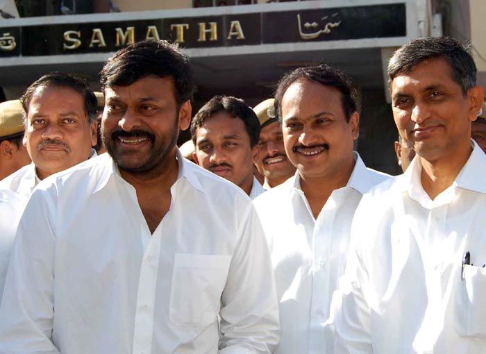 Prajarajyam President Chiranjeevi, BJP State President Kishan Reddy, Loksatta President Jayprakash Narayan along with other leaders coming out of the All-Party meeting chaired by Chief Minister N Kiran Kumar Reddy to discuss the relief package for rain-hit farmers from the Samatha Building, Secretariat in Hyderabad on Thursday. INN Photos