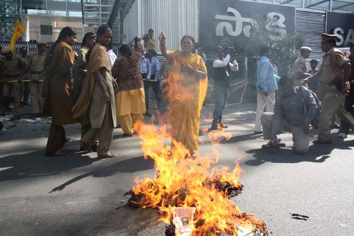 Telugu Desam Party activists burn copies of Telugu Daily Sakshi to protest against anti-Chandrababu Naidu comments published by the newspaper at Banjara Hills in Hyderabad on Thursday. INN Photos
