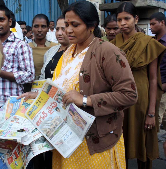 Telugu Desam Party activists burn copies of Telugu Daily Sakshi to protest against anti-Chandrababu Naidu comments published by the newspaper at Banjara Hills in Hyderabad on Thursday. INN Photos