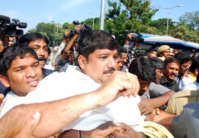 Telugu Desam Party MLA Yerrabelly Dayakar Rao and MP Venugopal Reddy stage a protest in front of the C Block of the state Secretariat in Hyderabad on Friday. The two were among scores of other TDP leaders who courted arrest in protest against the government's indifference to the plight of rain-hit farmers. INN Photos