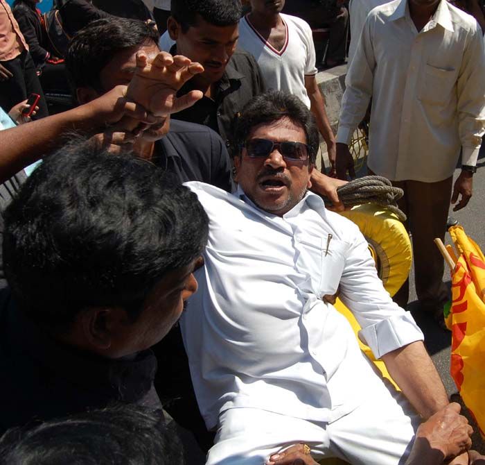 Police take senior Telugu Desam Party leader Nandamuri Harikrishna and other leaders in custody after stopped the combined TDP-Left Rally to protest against the government's adamant stance on the opposition demand to revise the relief package for rain-hit farmers in front of the Ravindra Bharati in Hyderabad on Friday. INN Photos
