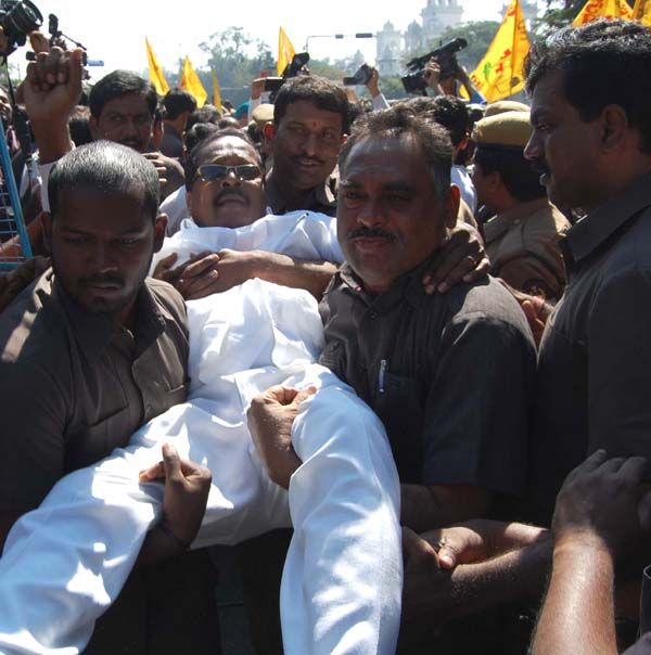 Police take senior Telugu Desam Party leader Nandamuri Harikrishna and other leaders in custody after stopped the combined TDP-Left Rally to protest against the government's adamant stance on the opposition demand to revise the relief package for rain-hit farmers in front of the Ravindra Bharati in Hyderabad on Friday. INN Photos