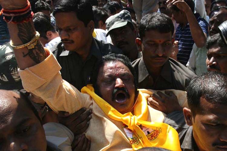 Police take senior Telugu Desam Party leader Nandamuri Harikrishna and other leaders in custody after stopped the combined TDP-Left Rally to protest against the government's adamant stance on the opposition demand to revise the relief package for rain-hit farmers in front of the Ravindra Bharati in Hyderabad on Friday. INN Photos