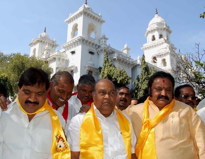 Police take senior Telugu Desam Party leader Nandamuri Harikrishna and other leaders in custody after stopped the combined TDP-Left Rally to protest against the government's adamant stance on the opposition demand to revise the relief package for rain-hit farmers in front of the Ravindra Bharati in Hyderabad on Friday. INN Photos