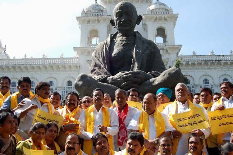 Police take senior Telugu Desam Party leader Nandamuri Harikrishna and other leaders in custody after stopped the combined TDP-Left Rally to protest against the government's adamant stance on the opposition demand to revise the relief package for rain-hit farmers in front of the Ravindra Bharati in Hyderabad on Friday. INN Photos