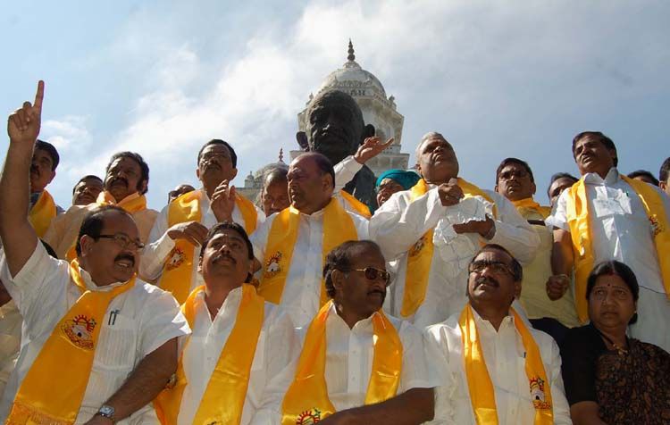 TDP leaders pay home to the Mahatma Gandhi statue before taking out a rally against the government's failure in announcing an adequate relief package for rain-hit farmers at Assembly premises in Hyderabad on Friday. INN Photos