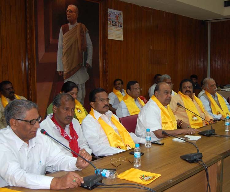 Telugu Desam Legislature Party meets to discuss the strategy to be adopted to to continue the fight for justice for rain-hit farmers at Assembly premises in Hyderabad on Friday. TDP and Left party representative attended the meeting. INN Photos