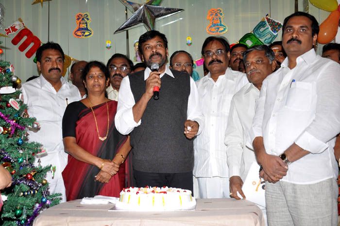 Praja Rajyam Party president K Chiranjeevi cuts a cake as part of Christmas celebrations at party office in Jubilee Hills in Hyderabad on Saturday. INN Photos