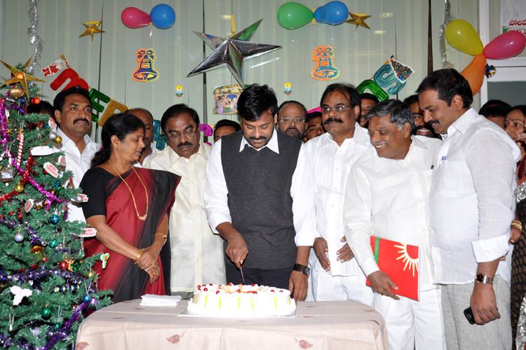 Praja Rajyam Party president K Chiranjeevi cuts a cake as part of Christmas celebrations at party office in Jubilee Hills in Hyderabad on Saturday. INN Photos