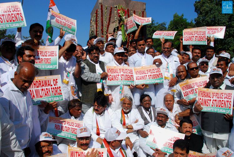 Congress MPs from Telangana region hold placards during their indefinite hunger strike launched on Monday at Gun Park in Hyderabad demanding the withdrawal of all police cases against students who were part of marches demanding a separate state .