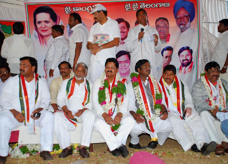 Congress MPs from Telangana region hold placards during their indefinite hunger strike launched on Monday at Gun Park in Hyderabad demanding the withdrawal of all police cases against students who were part of marches demanding a separate state .