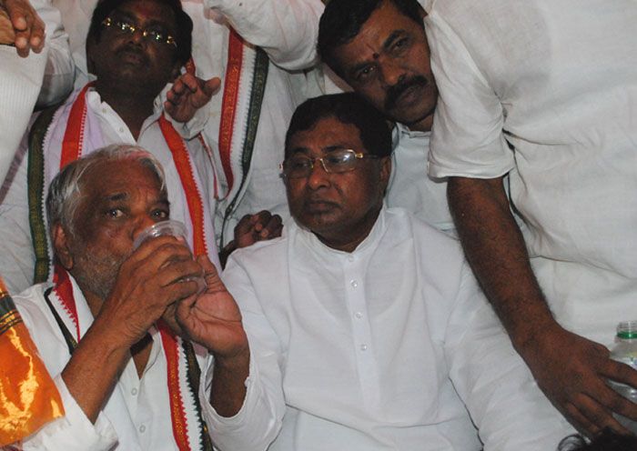 Telangana Congress MPs breaks their one and half day old indefinet fast on Tuesday by accepting lemon juice after the state government announced its decision of lifting all police cases filed against students during seperate state agitation last year.