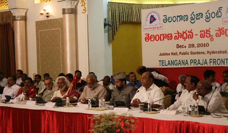 Balladeer Gadar addresses the participants at a Round Table discussion on the Telangana issue at the Jubilee Hall in Hyderabad on Wednesday. INN Photos