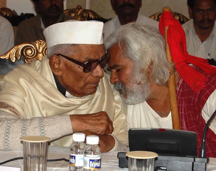 Balladeer Gadar addresses the participants at a Round Table discussion on the Telangana issue at the Jubilee Hall in Hyderabad on Wednesday. INN Photos